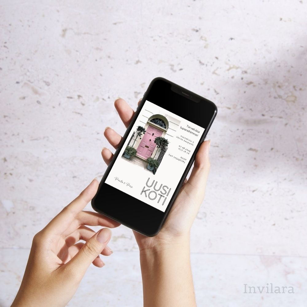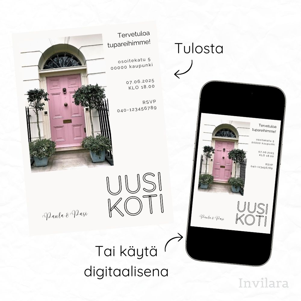 Tämä digitaalinen tupaantulijaiskutsu on täydellinen valinta, jos etsit kaunista, edullista ja helposti muokattavaa kutsua juhliin. Lisää vain kuva omasta ovestasi tai käytä sellaisenaan!