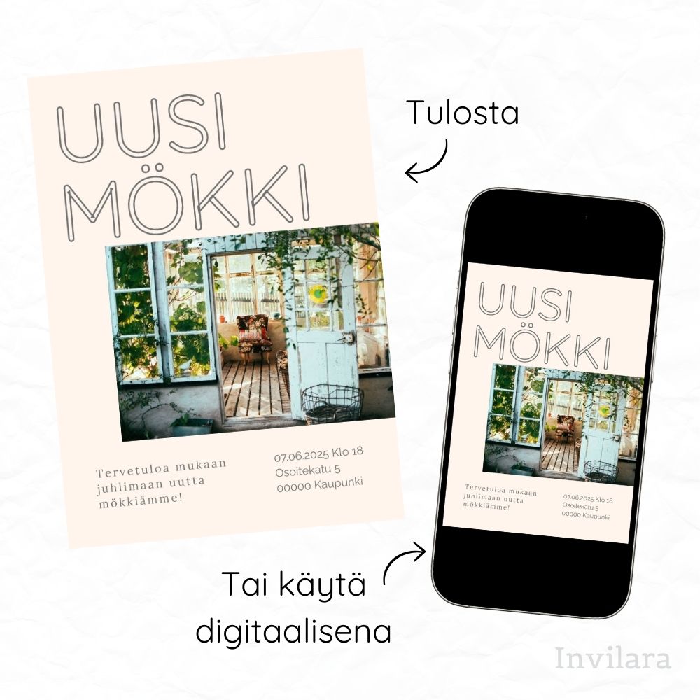 Tämä digitaalinen tupaantulijaiskutsu on täydellinen valinta, jos etsit kaunista, edullista ja helposti muokattavaa kutsua juhliin. Lisää vain kuva omasta mökistäsi tai käytä sellaisenaan!