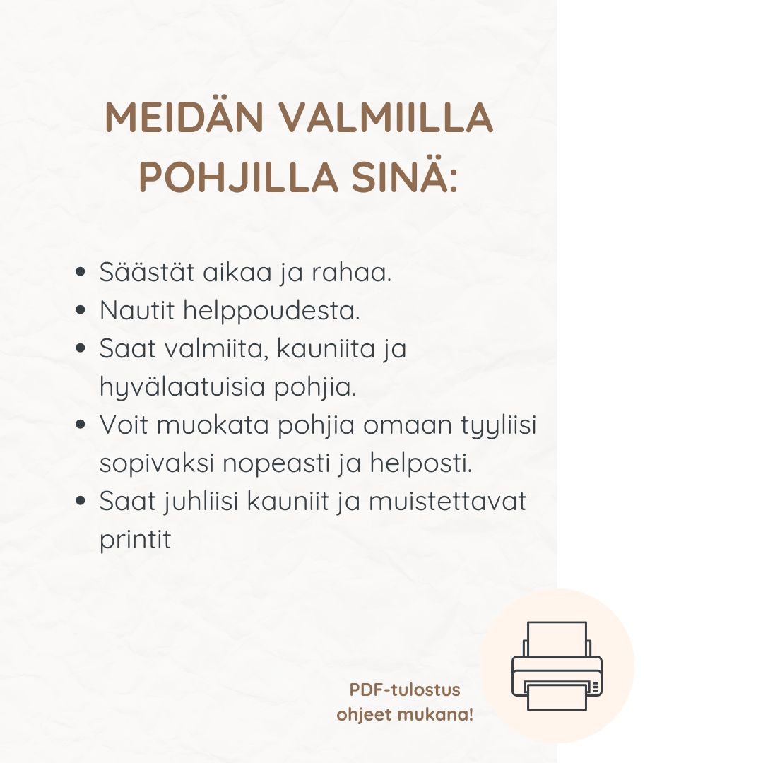 - Sivun kokoa ei voi muokata, eikä suuntaa voi vaihtaa pystystä vaaka-asentoon (A4 vaaka). Mikäli haluat eri koon, ota meihin yhteyttä!