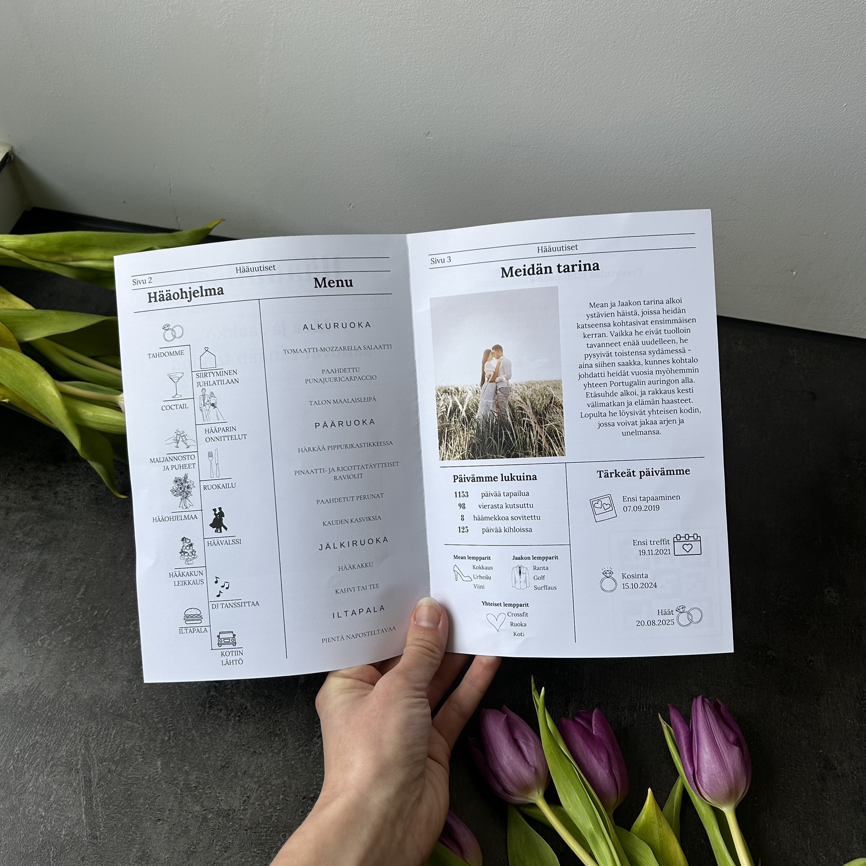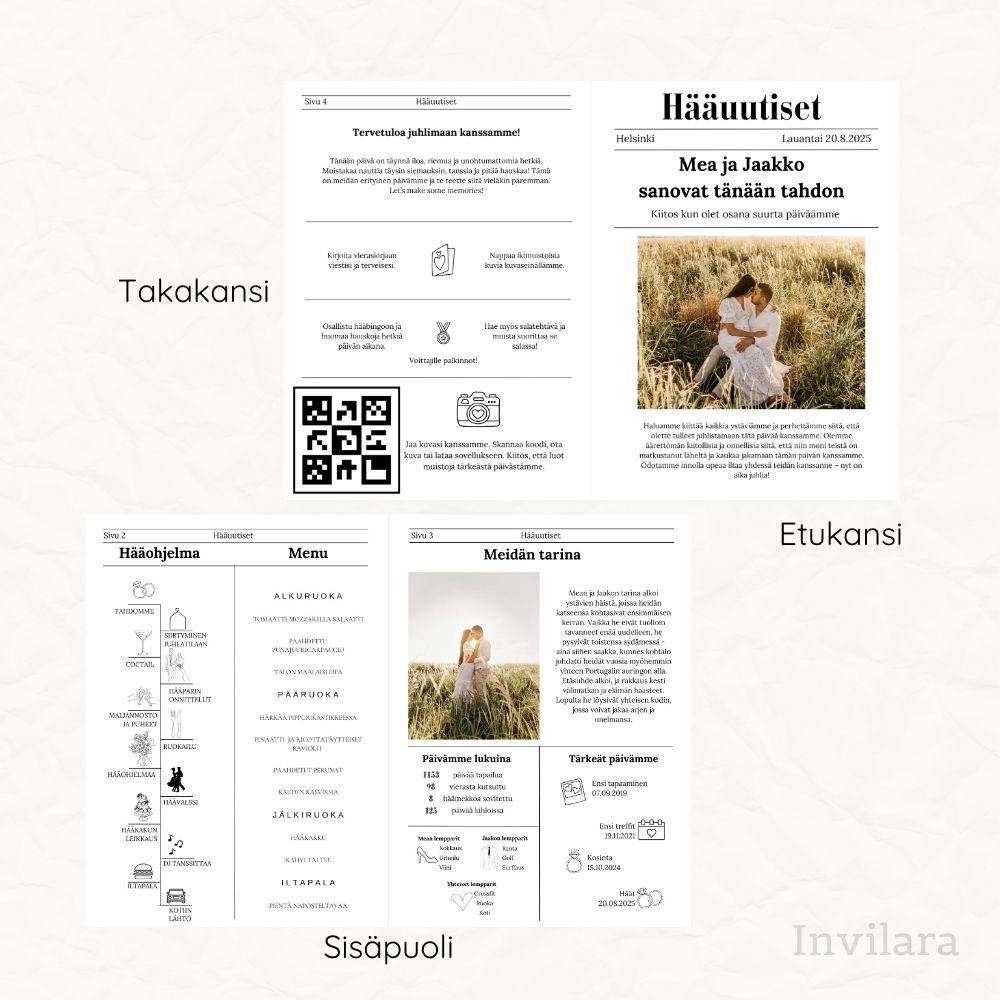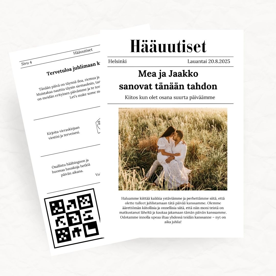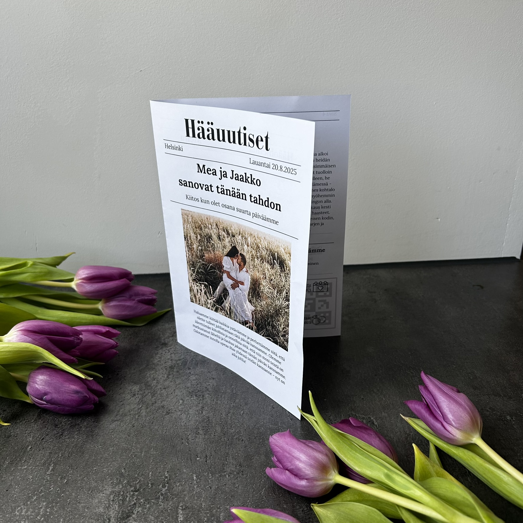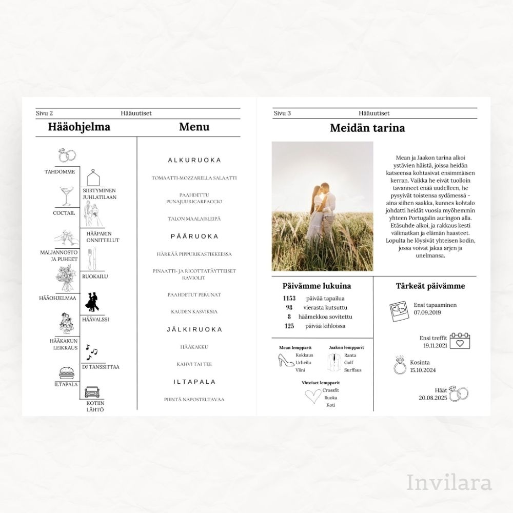 Suositut Hääuutiset nyt myös Invilaralta! Tämä kaunis hääuutinen on täydellinen tapa jakaa häävieraille tärkeät tiedot ja samalla kertoa oma rakkaustarinanne. Tämä A4-kokoinen taitettava lehtinen on helposti muokattavissa, ja se on suunniteltu niin, että siihen voi kirjoittaa esimerkiksi häiden ohjelman, menun, tarinan ja kaikki muut tärkeät yksityiskohdat. Samalla näyttäen kuin sanomalehdeltä! Ja mikä parasta, se ei vie paljon aikaa tai vaivaa tehdä. Hääuutiset ovat uusi suosittu häiden yksityiskohta!