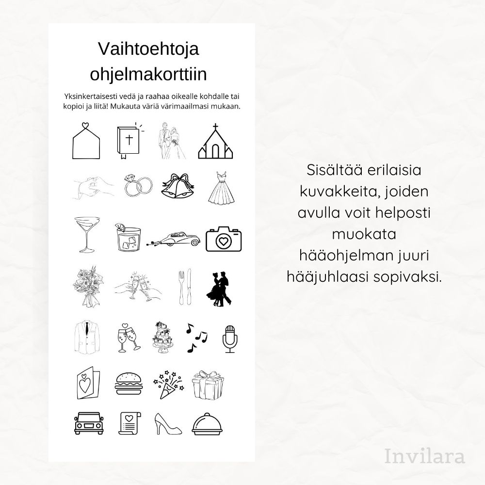 - Muokattavuus: Kutsu on täysin muokattavissa – voit lisätä oman tarinanne, häiden ohjelman ja muun sisällön helposti.