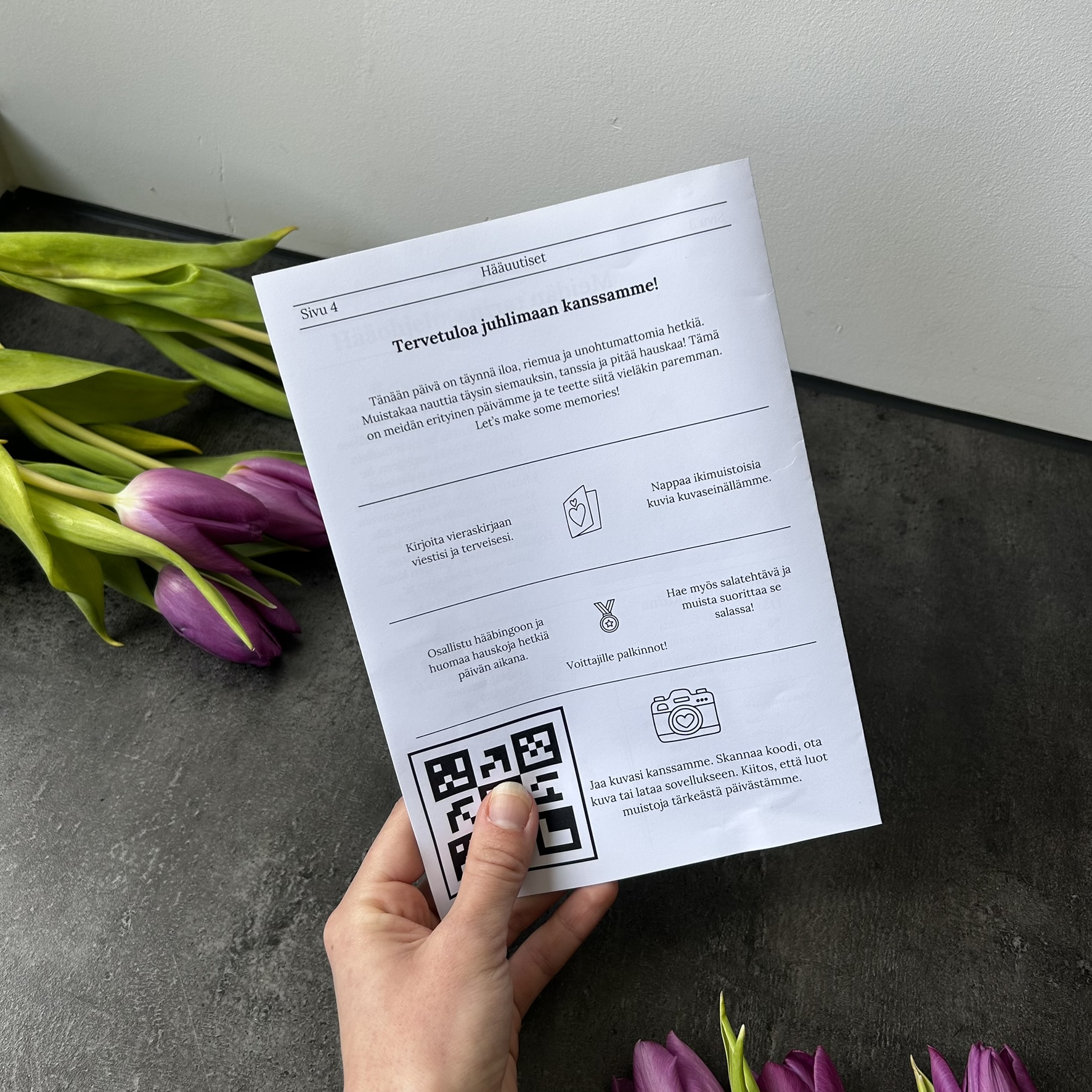- Helppous ja nopeus: Taitettavan hääuutisen saa nopeasti valmiiksi! Lataa tiedosto, muokkaa tekstit ja lisää kuvat. Valmista! Nyt voit tulostaa hääuutisen itse kotona tai vaihtoehtoisesti käydä tulostuttamassa edullisesti.