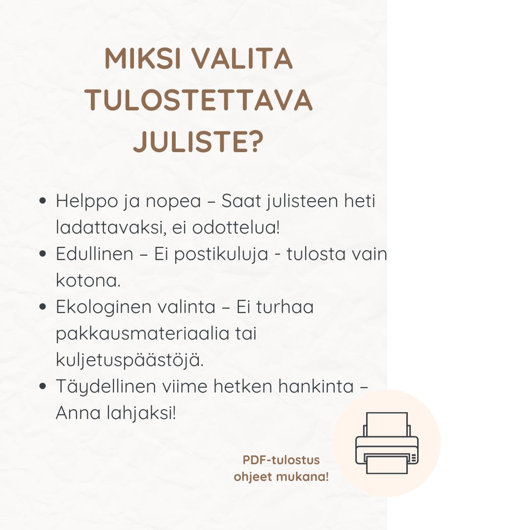 Tämä on täydellinen juliste, joka sopii mainiosti tulostettavaksi, kehystettäväksi ja annettavaksi lahjaksi läheisellesi. Lataa tiedosto, tulosta ja kehystä – helppoa ja nopeaa! Ajaton design istuu monenlaisiin sisustuksiin ja sitä voi muokata kehyksillä, jotta se vastaa saajan makua.