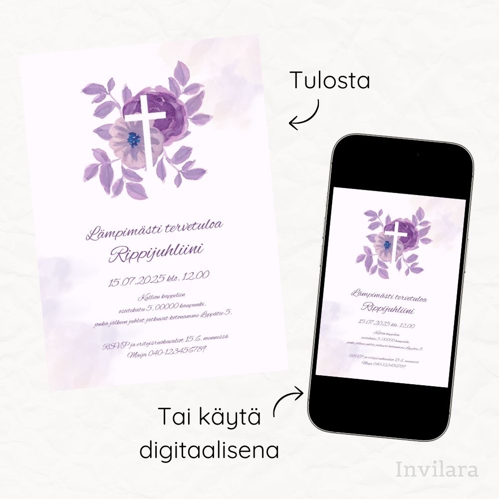 Kutsu vieraasi rippijuhliin tällä kauniilla digitaalisella rippijuhlakutsulla! Muokattavissa oleva kutsu auttaa sinua luomaan juuri sellaisen ilmeen, jonka haluat – edullisesti ja nopeasti.