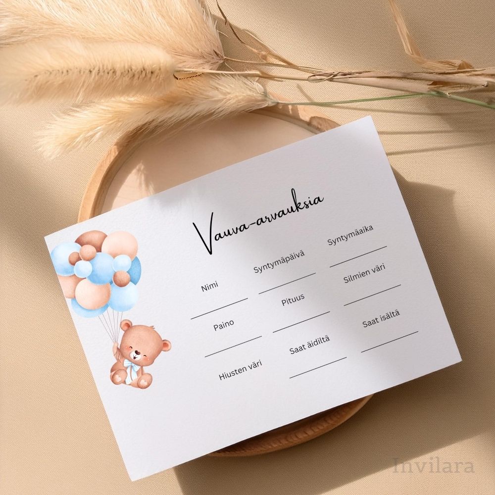 Nalle vauva-arvauksia valmis tehtäväkortti vauvakutsuille