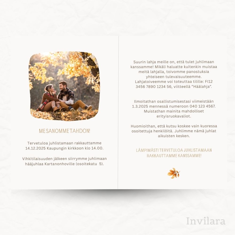 • Muokattavuus: Kutsu on täysin muokattavissa – voit valita värit, tekstit ja kuvat juuri omien toiveidesi mukaan, ja luoda juuri sellaisen kutsun kuin olet aina unelmoinut.
