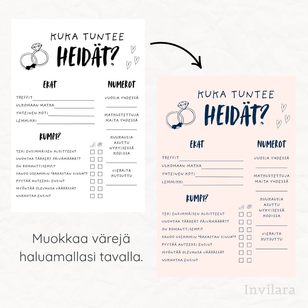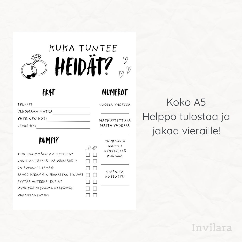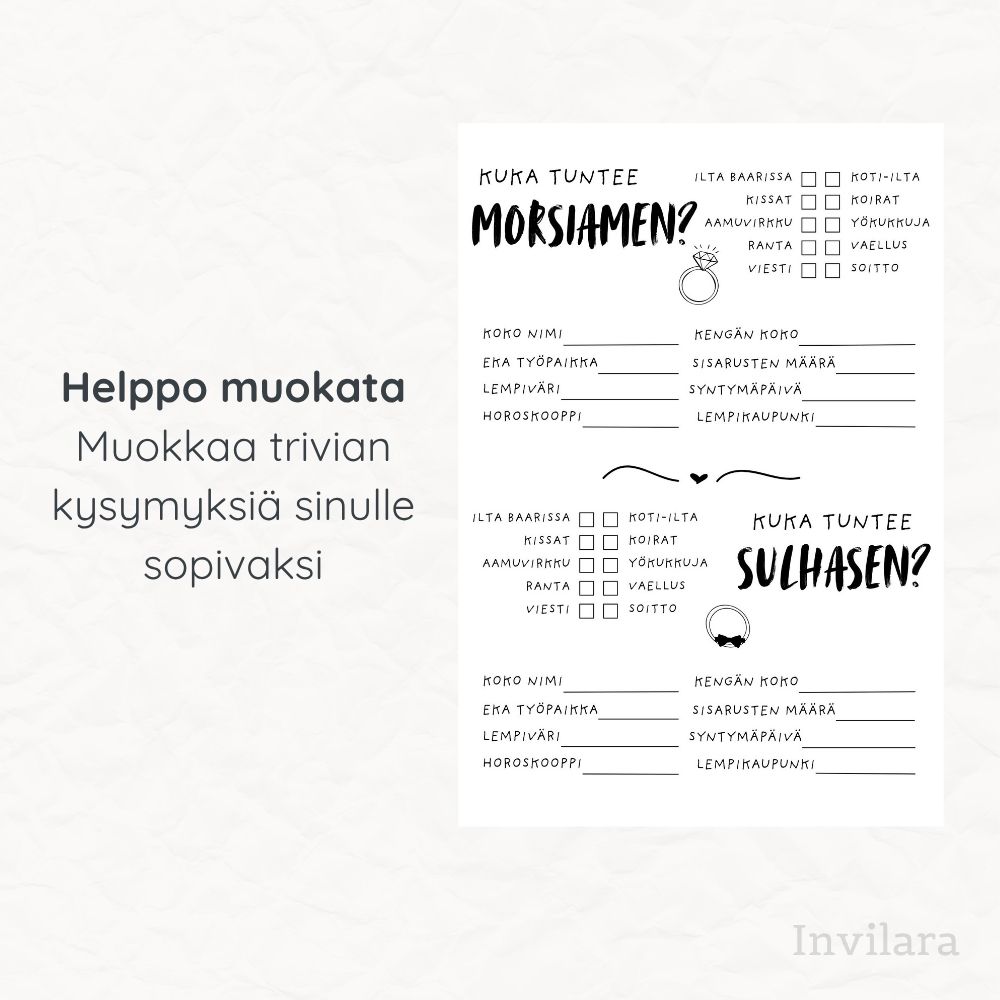 Lisää hauskaa tekemistä vieraille hääjuhlaasi! Tämä tulostettava häätrivia saa vieraat nauramaan ja kilpailemaan siitä, kuka tuntee hääparin parhaiten.