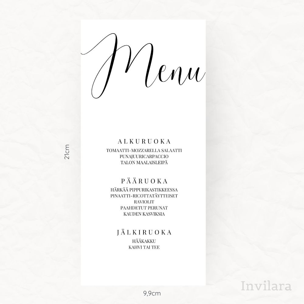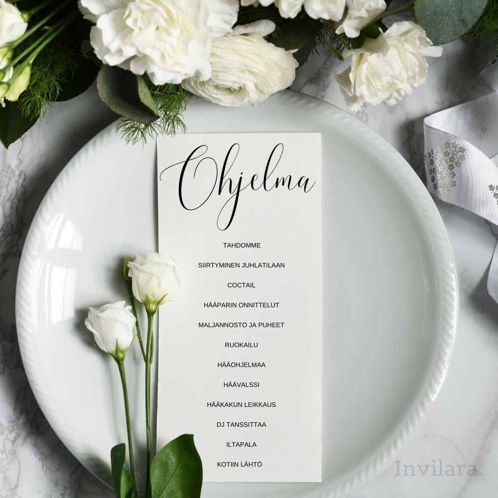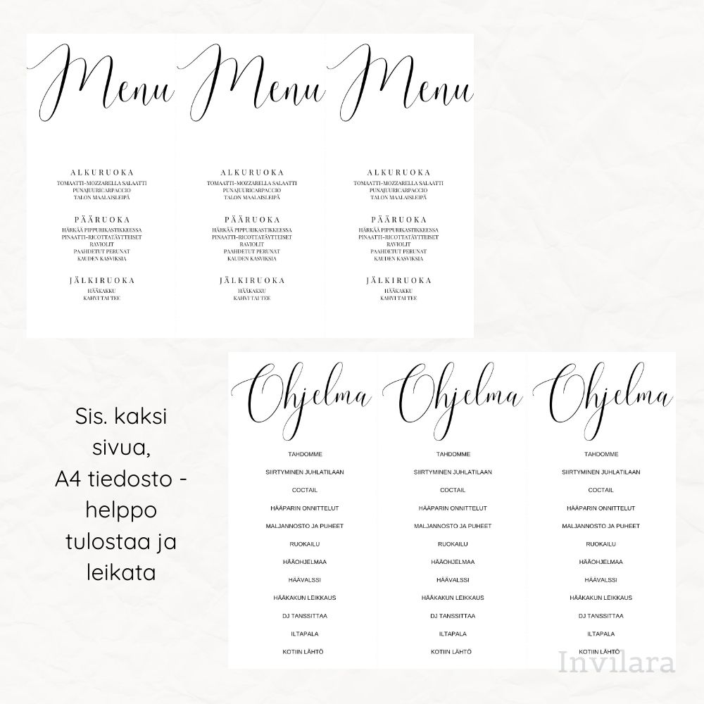 Viimeistele juhlapöytä tyylikkäällä hääohjelma- ja menukorteilla! Ohjelma kertoo päivän tärkeimmät hetket, ja menu esittelee herkulliset tarjoilut – näin vieraat pysyvät mukana juhlan kulussa ja voivat odottaa innolla seuraavia elämyksiä. Kaunis ja helposti tulostettava kokonaisuus, joka tuo juhlaan viimeistellyn ilmeen.