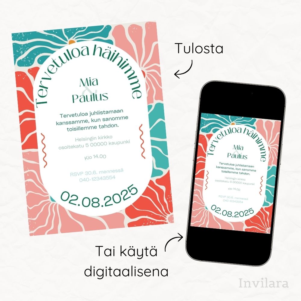 - Muokattavuus: Kutsu on täysin muokattavissa – voit valita värit, tekstit ja kuvat juuri omien toiveidesi mukaan, ja luoda juuri sellaisen kutsun kuin olet aina unelmoinut.