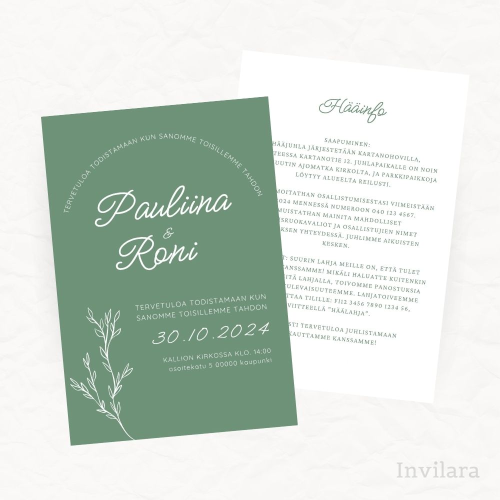 • Helppous ja nopeus: Tämä kutsu on valmis muutamassa minuutissa! Lataa tiedosto, muokkaa nimet ja häiden yksityiskohdat ja kutsu on valmis.