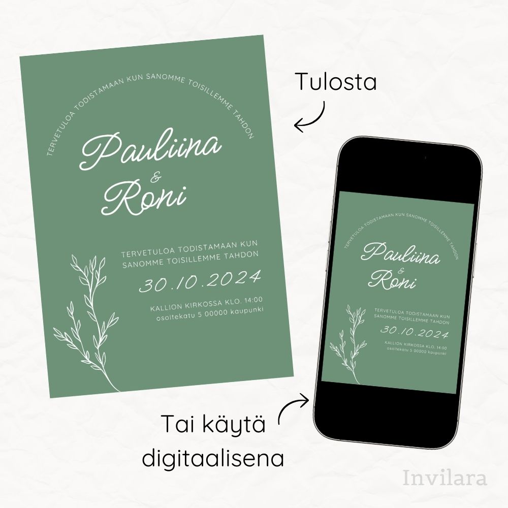 • Muokattavuus: Kutsu on täysin muokattavissa – voit valita värit, tekstit ja kuvat juuri omien toiveidesi mukaan, ja luoda juuri sellaisen kutsun kuin olet aina unelmoinut.