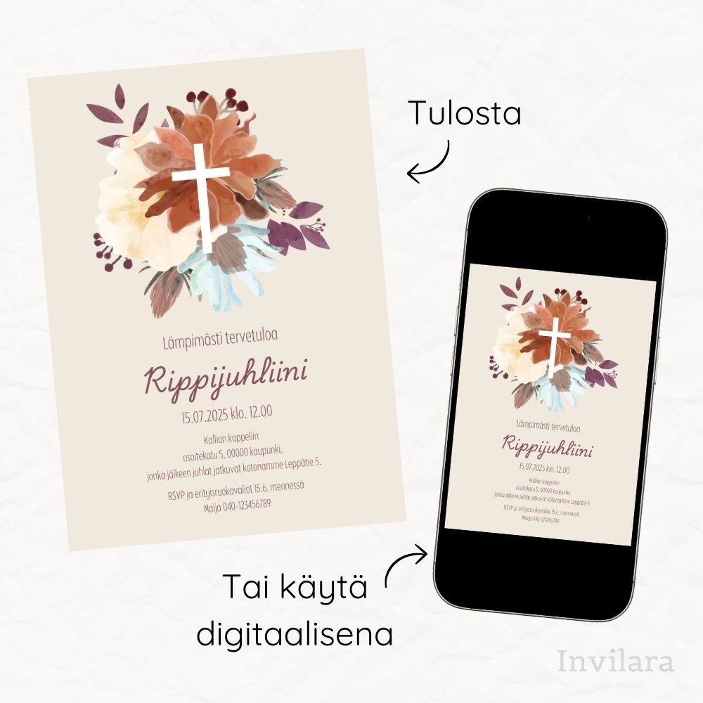 Kutsu vieraasi rippijuhliin tällä kauniilla digitaalisella rippijuhlakutsulla! Muokattavissa oleva kutsu auttaa sinua luomaan juuri sellaisen ilmeen, jonka haluat – edullisesti ja nopeasti.