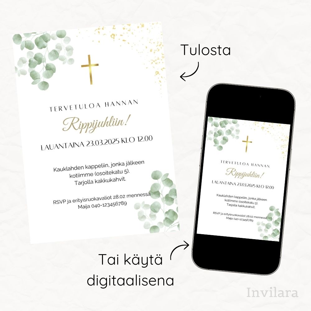 Kutsu vieraasi rippijuhliin tällä kauniilla digitaalisella rippijuhlakutsulla! Moderni ja helposti muokattava rippikutsu – viimeistele tyyliisi sopivaksi. Säästä aikaa, rahaa ja stressiä juhlajärjestelyissä.