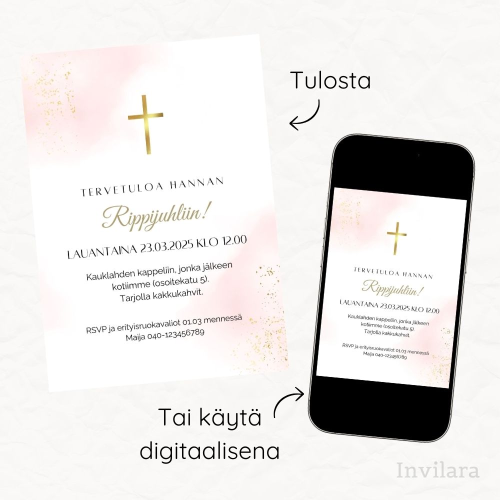Kutsu vieraasi rippijuhliin tällä kauniilla digitaalisella rippijuhlakutsulla! Moderni ja helposti muokattava rippikutsu – viimeistele tyyliisi sopivaksi. Säästä aikaa, rahaa ja stressiä juhlajärjestelyissä.